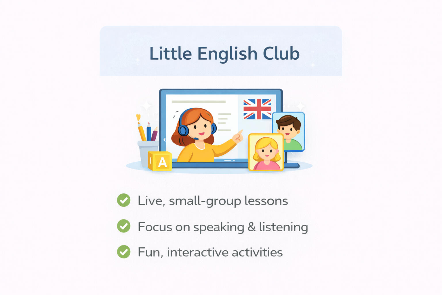 • Small groups guaranteedFamily schedules don’t look the same every week.Little English Club was designed to move with you — not the other way around.Because confidence grows through regular exposure — not rigid timetables.