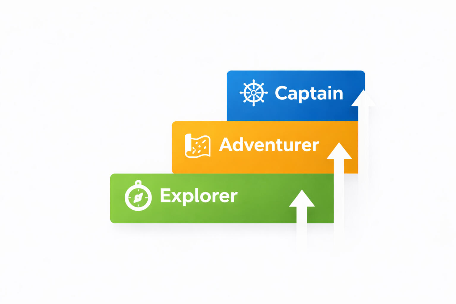 ✔ 3 structured levels: Explorer → Adventurer → Captain